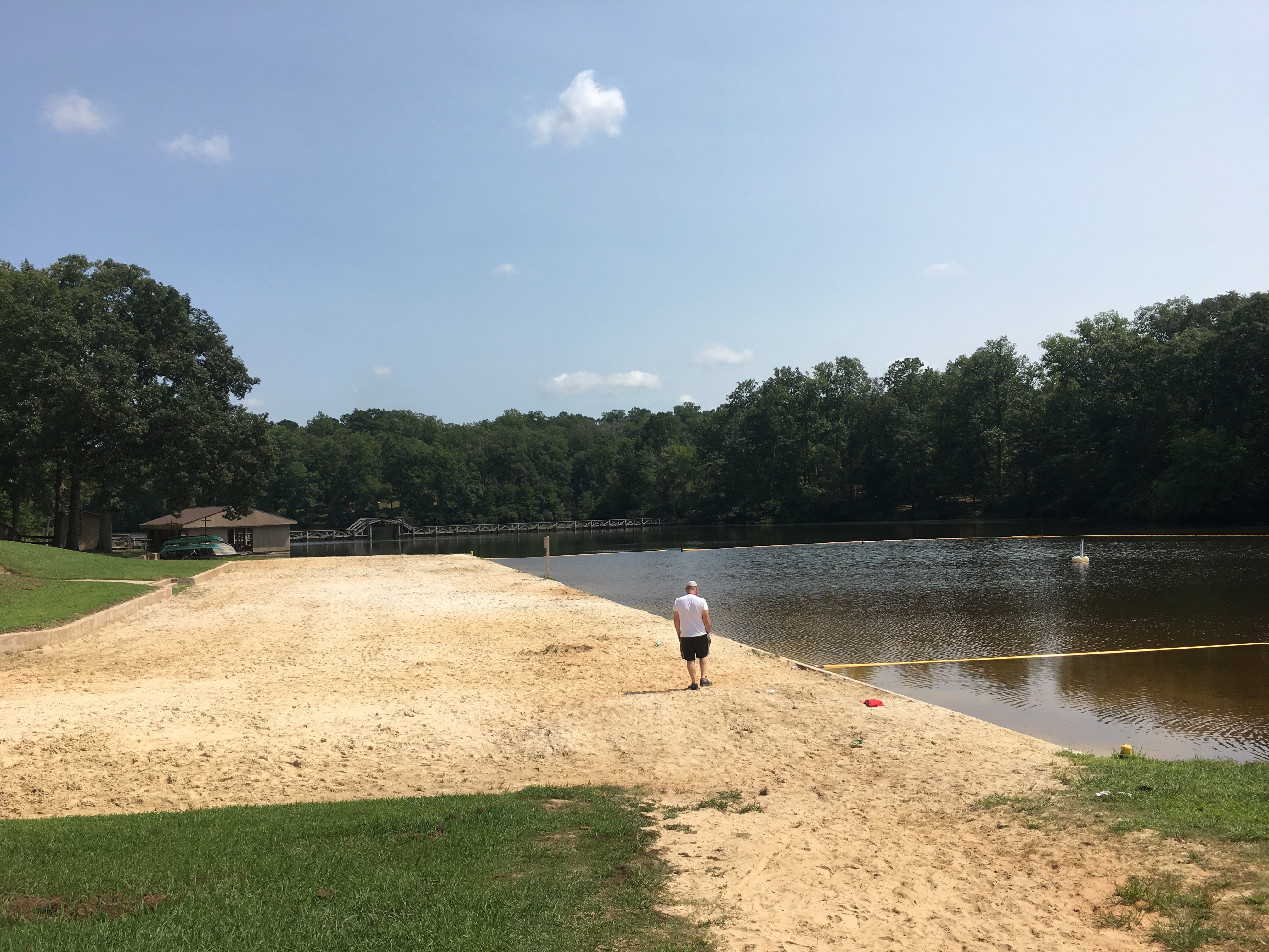 This park seems to have been very popular back in the 1950s. There are five loops with full and partial hookups and cabins to stay in. There’s a big lodge with a restaurant, a recreation center, a beach area with old paddleboats, and areas for archery with a firing range. It was a very big park. We really enjoyed the picnic shelters surrounded by the water and tall pine trees. The tables were all lined up on shore, making for great views and yoga.