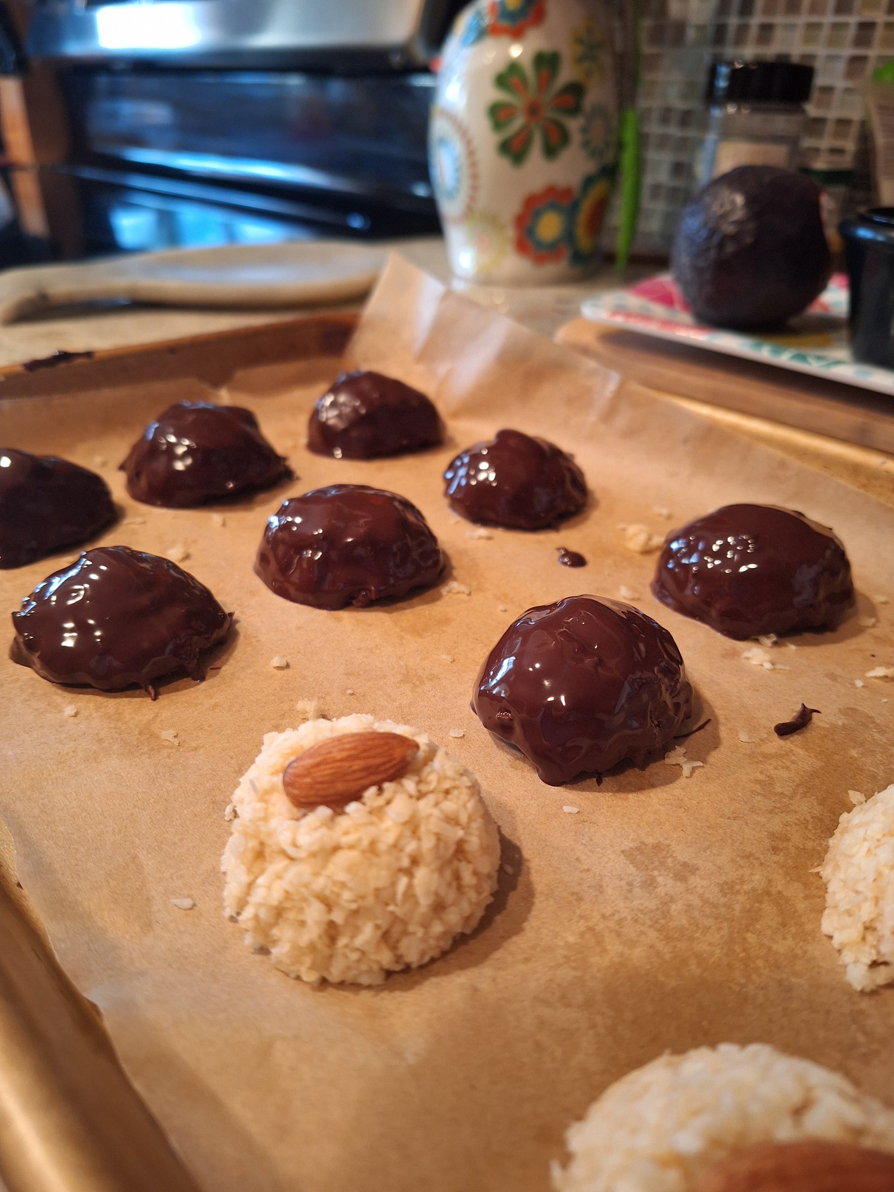 - Scoop 1 tablespoon of the mixture to make a compressed mound (you could also use a cookie scoop, or your hands) and place onto a baking sheet lined with parchment paper. Lightly press one almond into the top of the coconut mound. Repeat with remaining mixture. Freeze for about 15-20 minutes to firm up.
